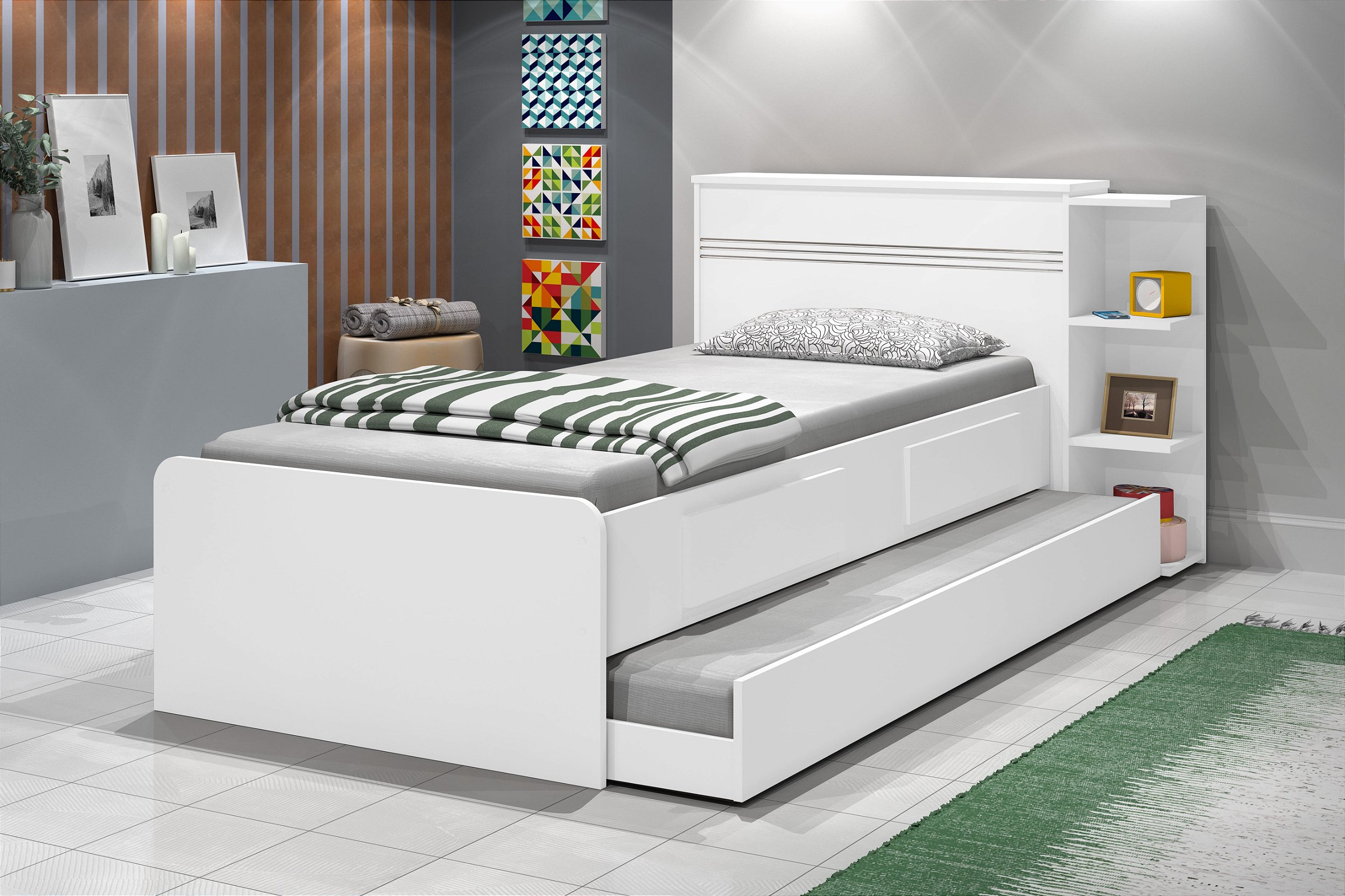 A Cama baú Jade agrega em um único produto funcionalidade e elegância. Possui três nichos na lateral da cabeceira e duas gavetas integradas na lateral do estrado, além do baú na cabeceira com tampo de abrir, que pode ser utilizado para acomodar travesseiro e roupas de cama por exemplo. Comporta. Produto estruturado em MDF/MDP com pintura UV e acabamento brilho. Acomoda colchão 0,88m x 1,88m.