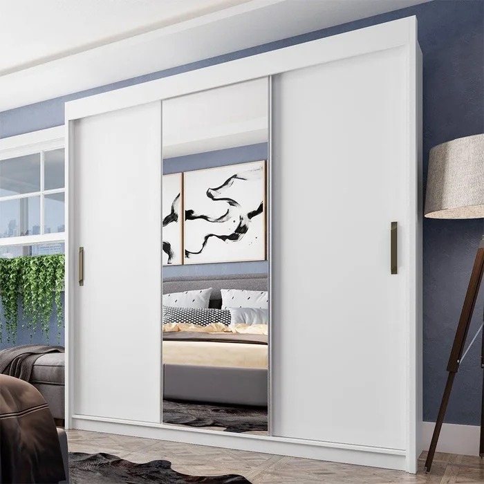O Guarda Roupas Madri foi desenvolvido para total conforto e modernidade, possui três portas de correr com suave deslize, sendo a porta central com espelho. Os perfis dos puxadores de alumínio, tornam o móvel ainda mais moderno, o armário possuí várias divisões para armazenar roupas e objetos, além das corrediças metálicas das quatro gavetas, ótimo acabamento com pintura UV de alta resistência proporcionando beleza ao produto! Materiais de primeira qualidade que respeitam o meio ambiente.
