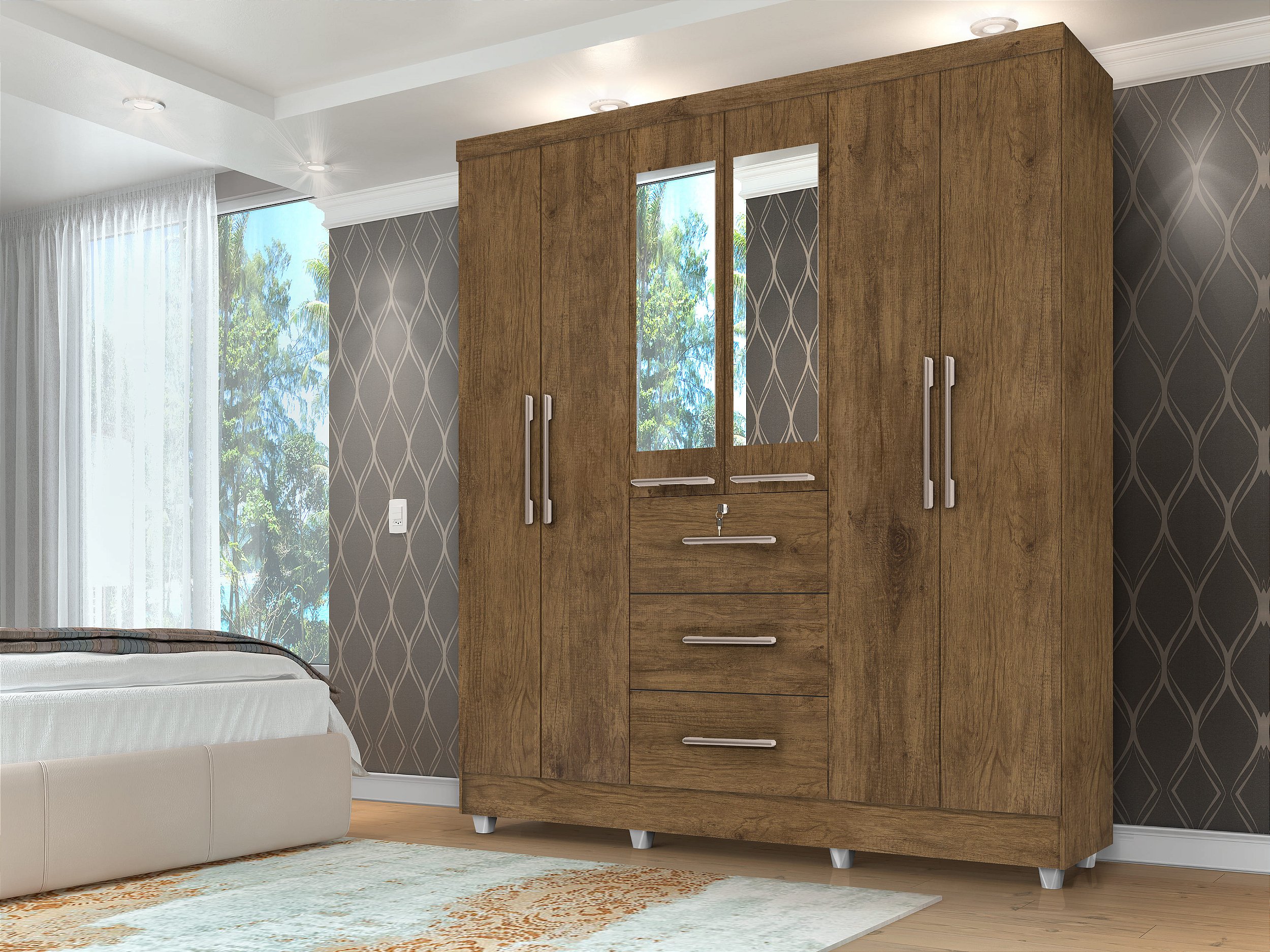 Guarda Roupa Roupeiro de Casal Tokio 6 portas 3 gavetas com chave e pés Jequitibá - J&A MOVEIS