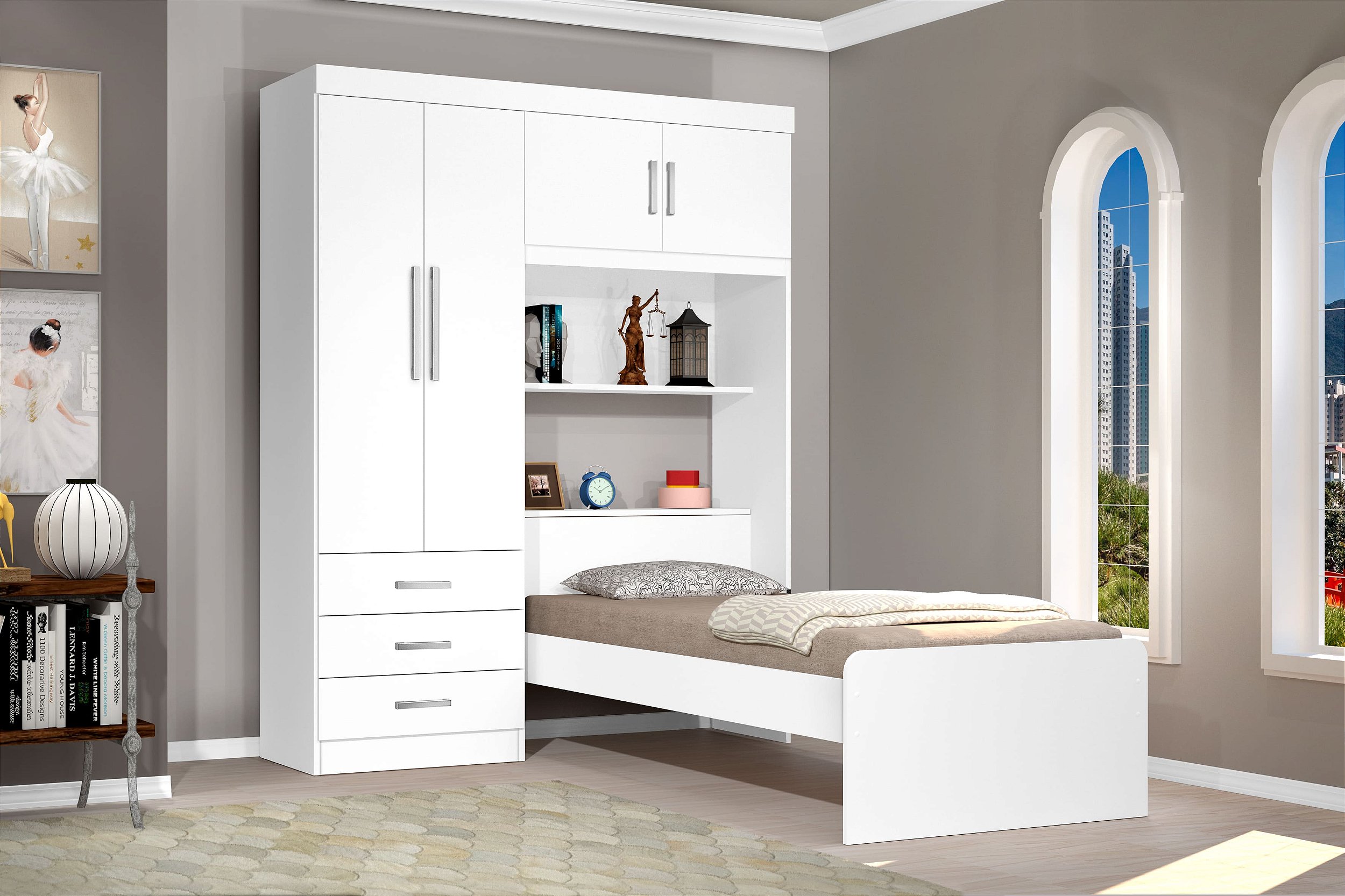 O Guarda-Roupa Cancun 4 portas é ideal para otimizar o espaço do ambiente e deixar tudo organizado. Possui 3 nichos internos, 1 nicho externo, 1 baú na cabeceira, 4 portas articuladas, 3 gavetas externas com corrediças metálicas. Possui pintura UV com acabamento verniz brilho, que oferece ao produto resistência e durabilidade.