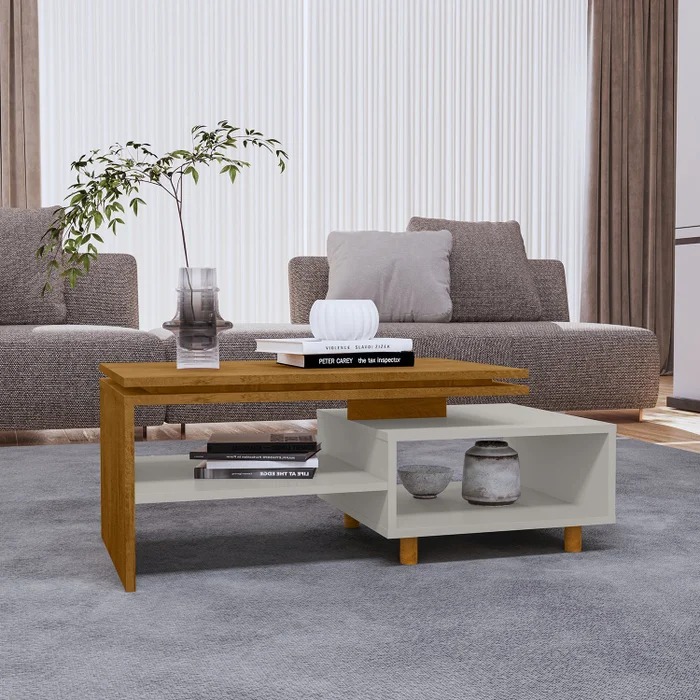 Mesa de Centro Decorativa Lima para Sala Tampo Duplo Design Moderno - Naturalle/Off