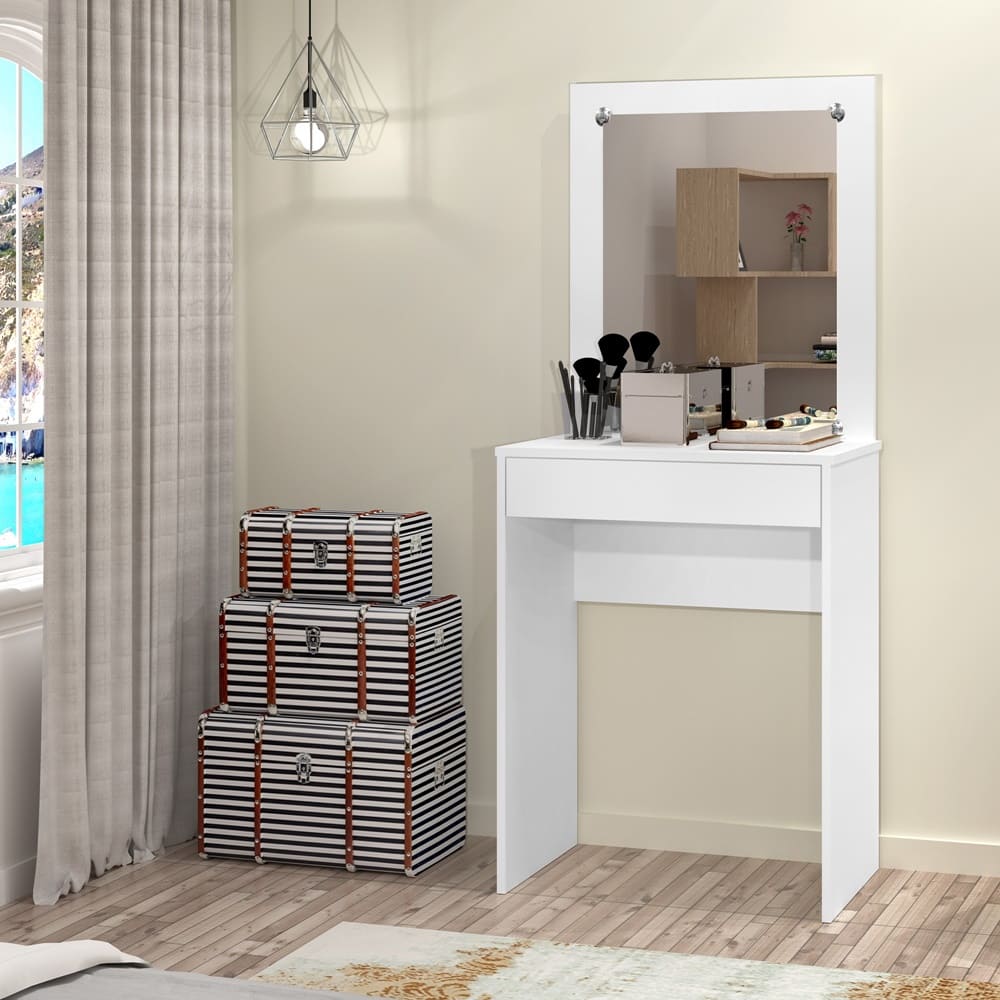 A penteadeira Sofia é ideal para você que quer organizar da melhor maneira todos os seus itens de maquiagem etc, sem ocupar muito espaço, de forma prática e eficiente. Possui uma gavata logo abaixo do tampo, e 1 espelho na parte superior. Produzida em MDP e acabamento em pintura UV e verniz brilho de alta qualidade, contribuindo para maior durabilidade e resistência do produto.