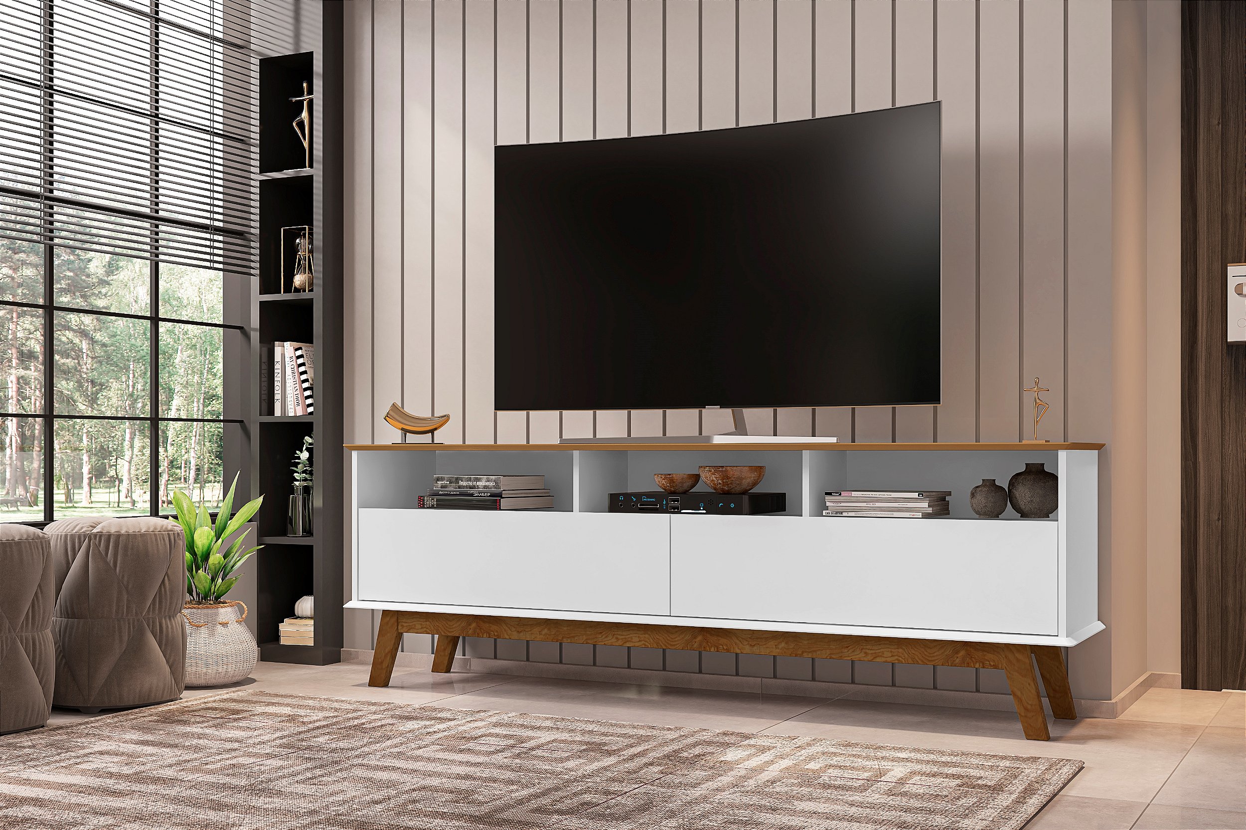 O Rack Elegant é a melhor escolha para sua sala! Com design retrô que irá encantar você. Ele possui tampo e base de MDF chanfrado em ângulo proporcionando ainda mais charme e requinte ao móvel! Seus pés são feitos de madeira maciça garantindo com isso ainda mais qualidade e resistência ao produto. Possui duas portas basculantes com dobradiças metálicas e amplo espaço interno. Suporta TVs de até 65 polegadas e seus amplos nichos são ideais para acomodar aparelhos eletrônicos, objetos de decoração, entre outros. Com tantas qualidades o Rack Elegant perfeito para sua sala!