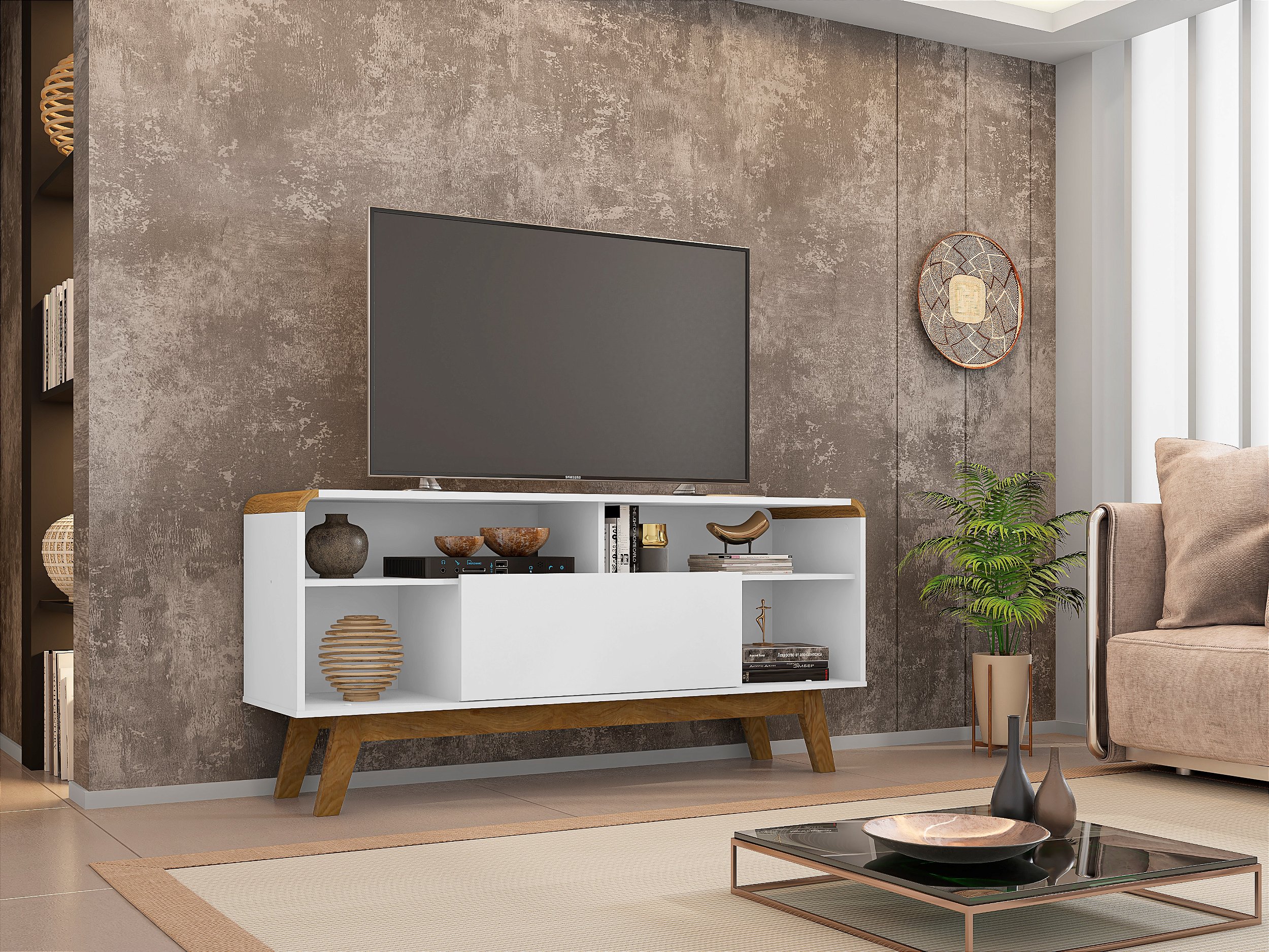 O Rack Lazuli é perfeito para sua sala! Com design retrô que alinhado com os cantos irão agregar muito mais charme e requinte ao seu ambiente. Ele suporta Tvs de até 55 polegadas. Amplo espaço para aparelhos eletrônicos, e portas com dobradiças metálicas. Pés de madeira maciça proporcionando ao produto maior resistência e durabilidade.