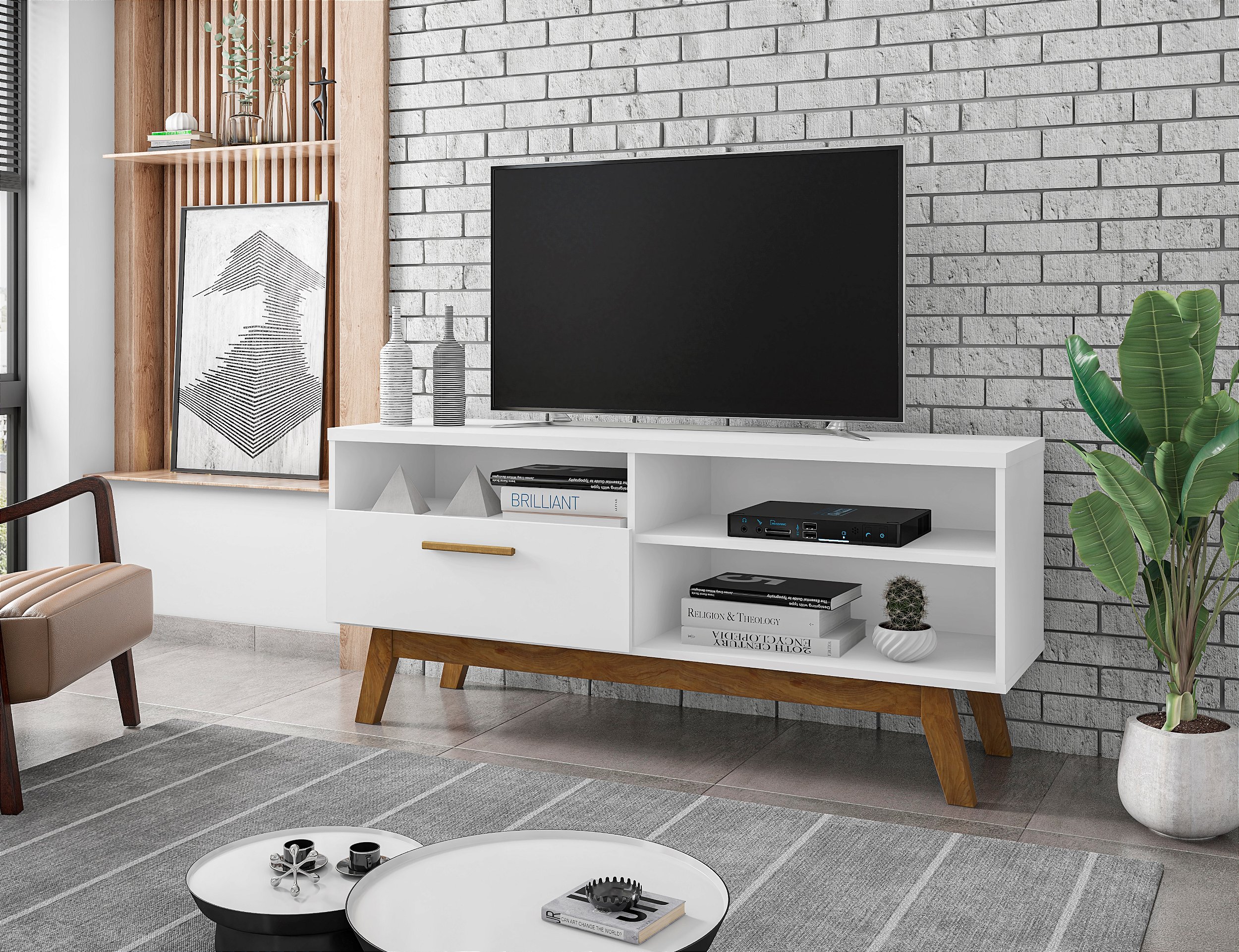 O Rack Paládio é a cara da nova geração de racks! Design inovador, mesclando o moderno com o Rêtro. Combinação de linhas retas com pés de madeira maciça que irá encantar você. Ideal para Tvs de 55 polegadas, ele conta com 3 nichos espaçosos ideais para acomodar os mais variados tipos de objetos de decoração, bem como aparelhos eletrônicos. Pés de madeira maciça que além de agregar charme e requinte ao móvel, também garantem maior resistência e segurança. Possui uma porta com amplo espaço interno e puxador de MDF Revestido.
