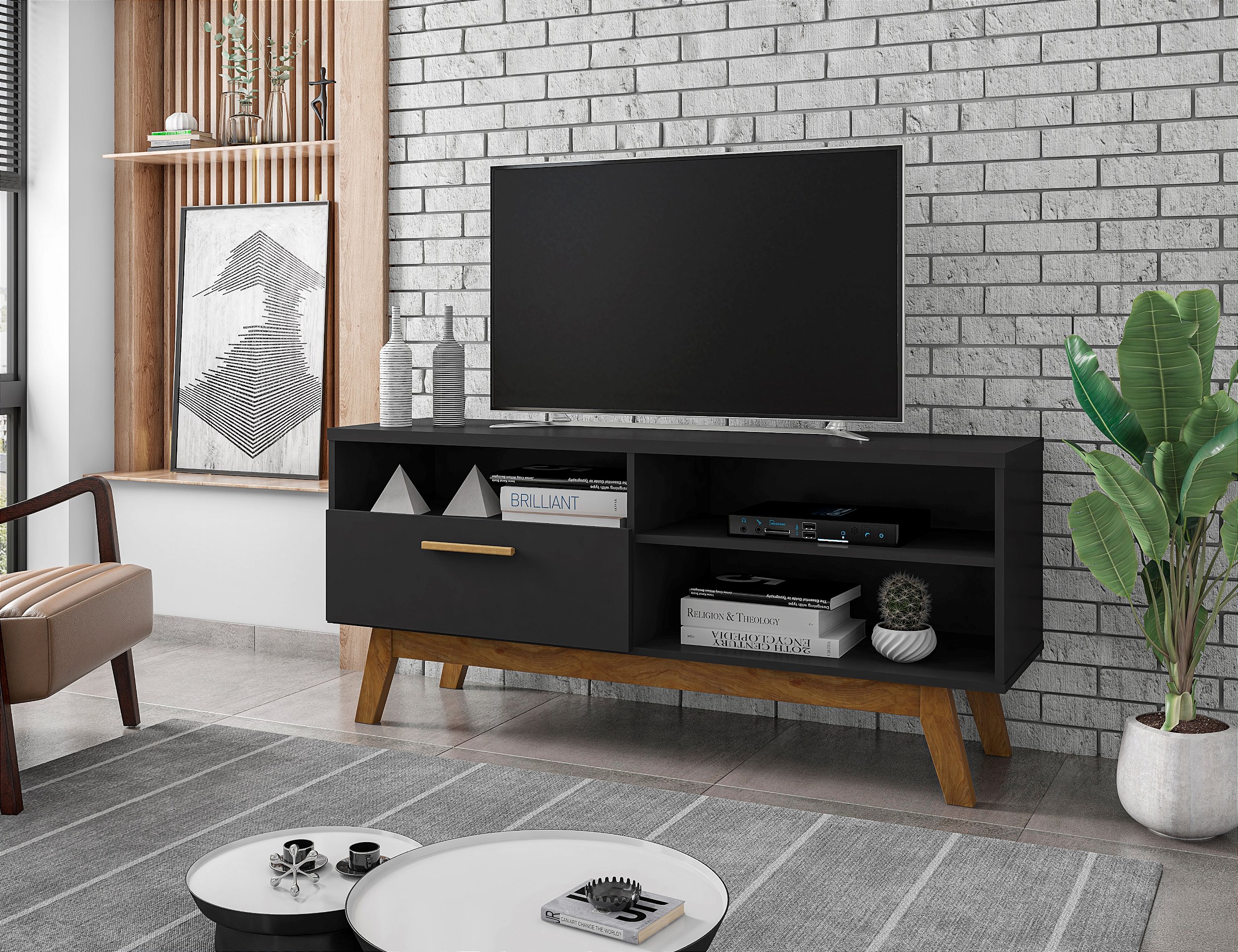 O Rack Paládio é a cara da nova geração de racks! Design inovador, mesclando o moderno com o Rêtro. Combinação de linhas retas com pés de madeira maciça que irá encantar você. Ideal para Tvs de 55 polegadas, ele conta com 3 nichos espaçosos ideais para acomodar os mais variados tipos de objetos de decoração, bem como aparelhos eletrônicos. Pés de madeira maciça que além de agregar charme e requinte ao móvel, também garantem maior resistência e segurança. Possui uma porta com amplo espaço interno e puxador de MDF Revestido.