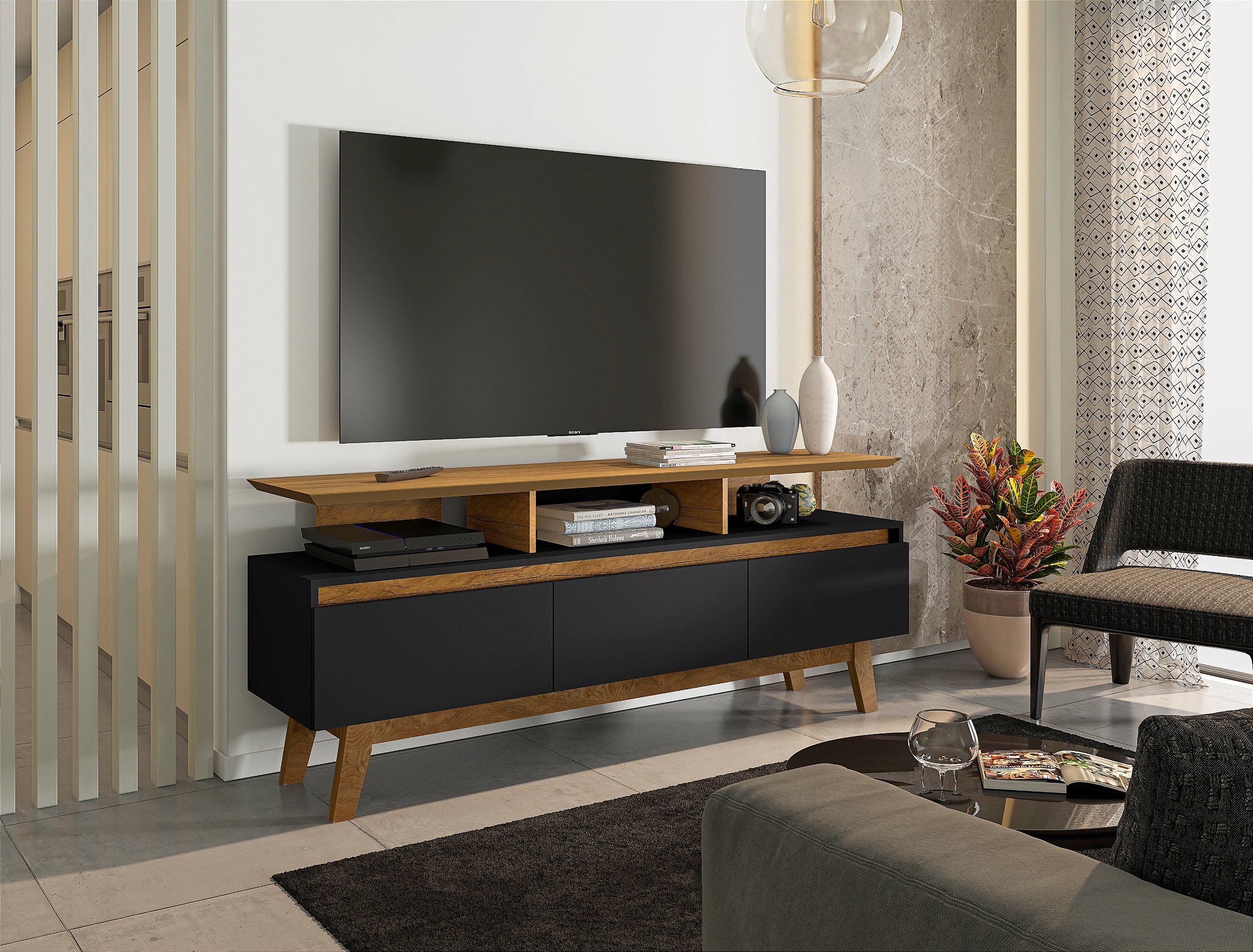 O Rack Rubi é a melhor escolha para sua sala! Com designer retrô que irá encantar você. Ele possui tampo de MDF 25mm chanfrado em ângulo proporcionando ainda mais charme e requinte ao móvel! Seus pés são feitos de madeira maciça garantindo com isso ainda mais qualidade e resistência ao produto. Possui três portas basculantes com dobradiças metálicas e amplo espaço interno. Ideal para TVs de até 60 polegadas e nichos ideais para acomodar aparelhos eletrônicos, objetos de decoração, entre outros. Com tantas qualidades o Rack Rubi é perfeito para sua sala!